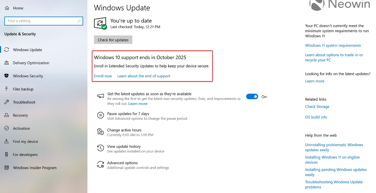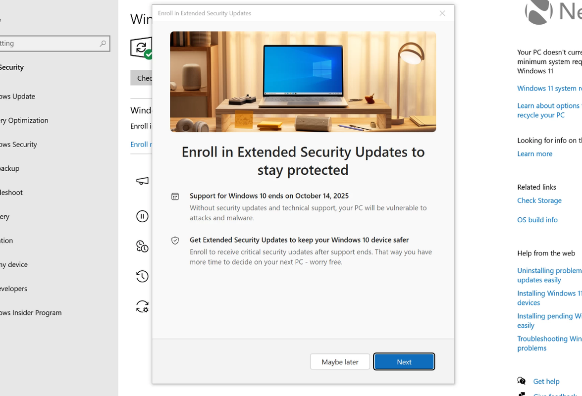 B2: Sau khi cài xong, quay lại Settings. Bạn sẽ thấy một banner cảnh báo: “Windows 10 support ends in October 2025” → Nhấn vào nút “Enroll Now”
