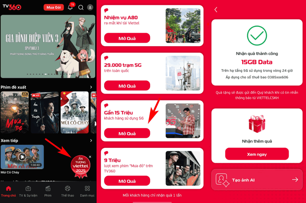 B3: Nhấn “Mở quà”. Ở mục “Gần 15 triệu khách hàng sử dụng 5G”