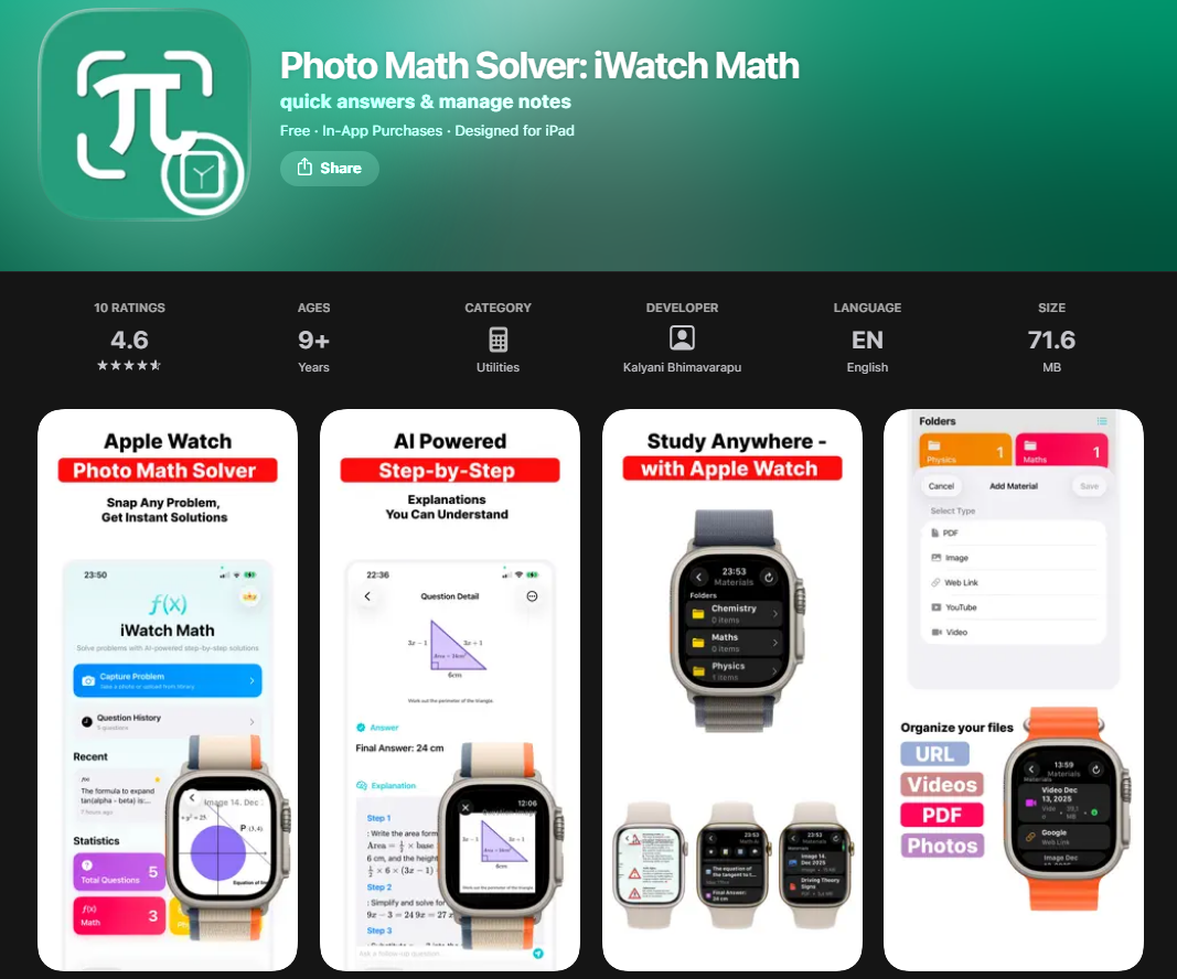 Nếu bạn đang tìm một ứng dụng học tập thông minh, giải bài nhanh và hỗ trợ học mọi lúc mọi nơi, thì Photo Math Solver: iWatch Math chính là lựa chọn không thể bỏ qua. Đặc biệt, ứng dụng đang được miễn phí trọn đời (Lifetime) trị giá $19.99 trên App Store – ưu đãi cực hiếm dành cho học sinh, sinh viên.