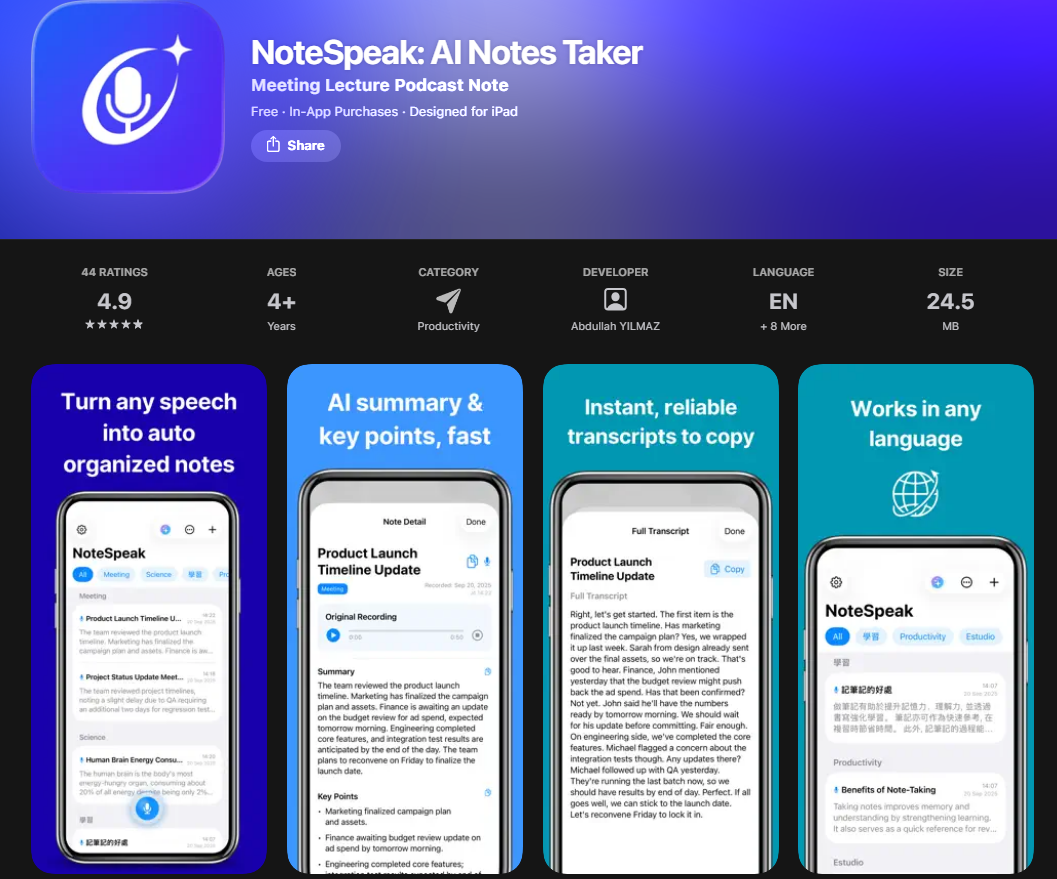 Đây là một ứng dụng ghi chú bằng giọng nói kết hợp trí tuệ nhân tạo (AI), cho phép bạn ghi âm – chuyển giọng nói thành văn bản – tóm tắt – phân loại toàn bộ nội dung một cách tự động, nhanh chóng và cực kỳ khoa học. Đặc biệt, NoteSpeak đang miễn phí gói Lifetime trị giá $69.99 trên cả App Store, một ưu đãi hiếm có dành cho những ai muốn nâng cao năng suất làm việc và học tập.